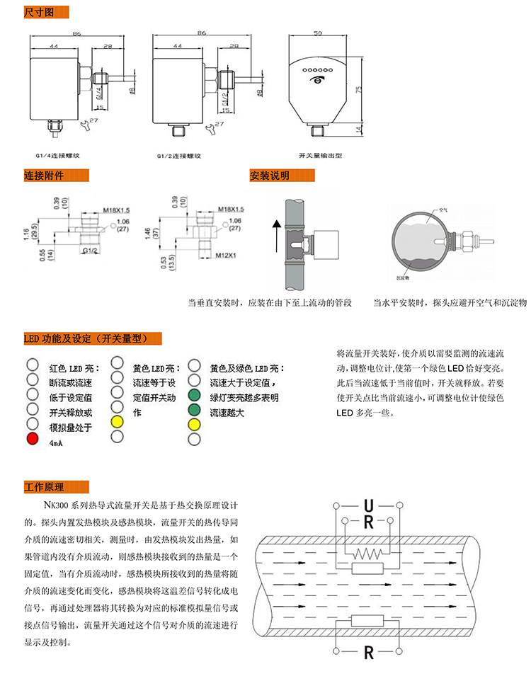 NK300系列熱導(dǎo)式流量開關(guān)可對(duì)管道中的液體流動(dòng)情況進(jìn)行實(shí)時(shí)監(jiān)控,無活動(dòng)部件,免維護(hù),安裝方便,一種型號(hào)是用于多種管徑要求,提供開關(guān)量輸出,并采用6個(gè)LED實(shí)時(shí)顯示流體流速狀態(tài),實(shí)現(xiàn)下列監(jiān)控功能:介質(zhì)流動(dòng),降低/提高流蘧:介質(zhì)存在/不存在;介質(zhì)流動(dòng)/靜止;監(jiān)控管道內(nèi)流體流速大小、斷流監(jiān)測(cè)或防止系的空轉(zhuǎn)。被廣泛應(yīng)用于石油化工電力、治金、廠紙、食口品加工、水處理、電池廠等行業(yè)。氣液兩用型,可用于氣動(dòng)和液壓系統(tǒng),可用于循環(huán)水,切割液及潤(rùn)滑油的斷流監(jiān)測(cè)。以及泵的空轉(zhuǎn)保護(hù)。