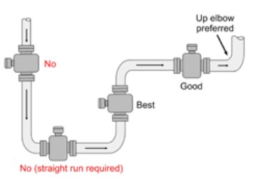 安裝電磁流量計(jì)時(shí),請(qǐng)避免向下流動(dòng)。彎頭后的水平配置要求儀表上游有五個(gè)管道直徑的直管。