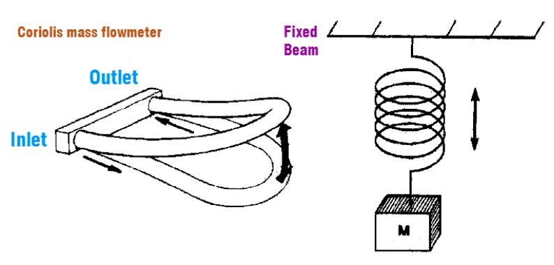 科里奧利質(zhì)量流量計(jì)也能夠給出流動流體的密度,其工作原理與彈簧和質(zhì)量組件的原理相同,如下圖所示。
