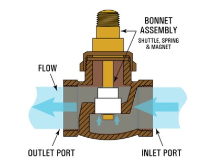 當流量達到開關的設定點時,磁梭克服了復位彈簧的向下力,并致動閥蓋閥桿內的密封SPDT簧片開關元件。