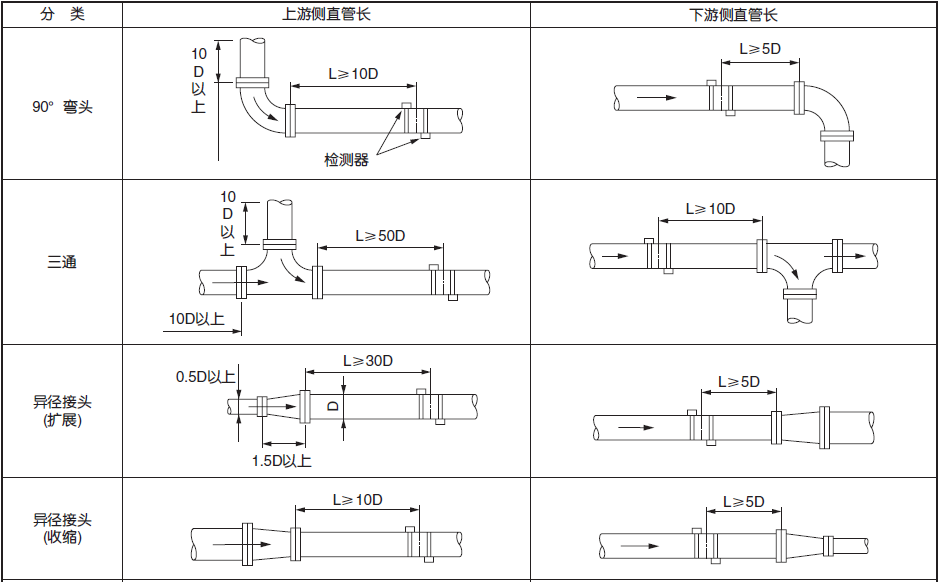 ◆ 選擇管材應(yīng)均勻致密,易于超聲波傳輸?shù)墓芏危?br /> ◆ 安裝點上游直管段必須要大于10D(注:D=直徑),下游要大于5D(見下圖);